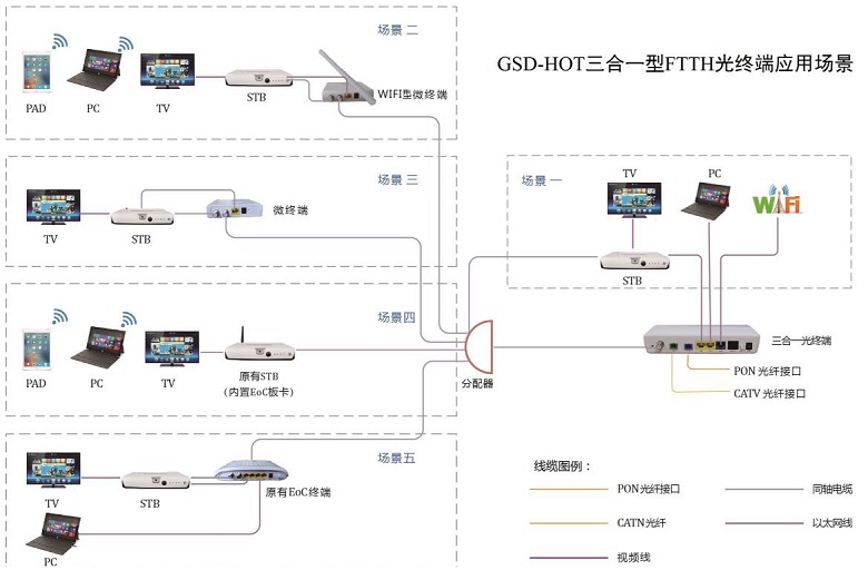 GSD-HOT 三合一型 FTTH 光终端是一款内置了 CATV 及 ONU 光模块和同轴电缆调制解调模块的无源光网络终端。该产品基于成熟稳定的 EPON 技术,并融合了千兆以太网交换技术和同轴电缆网 EoC 技术,不仅系统 可靠性高,而且组网部署方便,为 FTTH 网络光纤入户后驳接室内原有的同轴电缆网络提供了一个便捷的 解决方案,使原有的 EOC 网络设备(包括 EOC 终端和内置 EOC 模块的双向机顶盒)在不做任何改动的 情况下,就能方便地接入新建的 FTTH 网络,并能同时支持宽带上网和 VOD 点播等多个业务。